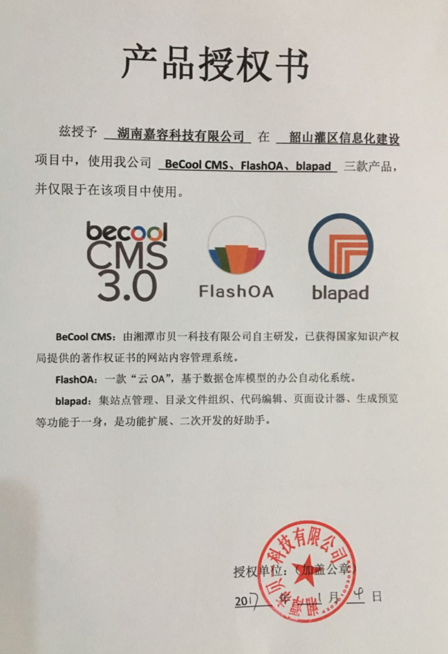 近日,貝一科技核心產(chǎn)品商業(yè)化又添喜訊,湖南華水科技、湖南嘉容科技和湖南六建集團三家公司,分別取得在韶山灌區(qū)2016年度續(xù)建配套與節(jié)水改造項目信息化建設工程項目中,貝一科技幾大核心產(chǎn)品(含BeCool CMS、FlashOA、blapad - 布拉編輯器) 的商業(yè)授權。