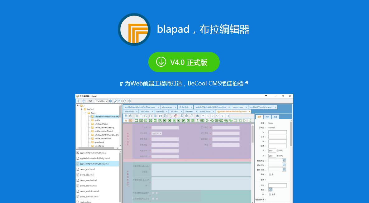 blapad - 布拉編輯器,是一款Web前端工程師使用的開發(fā)集成環(huán)境(IDE),集站點管理、目錄文件組織、頁面設(shè)計器、代碼編輯、生成、預(yù)覽等功能于一身。