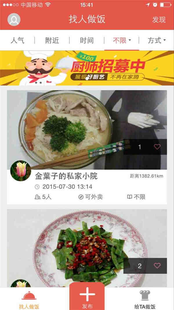 在家吃:由深圳在家文化傳播有限公司策劃的一種集家廚、社交、賺錢為一體的生活類APP,旨在為人們提供一個更為方便舒心的“吃飯”平臺,享受獨特的美味生活。是一款集家廚、社交、收益為一體的生活服務(wù)類手機應(yīng)用軟件,主要面向兩個群體:擁有好廚藝卻賦閑在家的社區(qū)阿姨或大叔以及身處異鄉(xiāng)想吃家鄉(xiāng)菜又不想自己做飯的上班族。阿姨或大叔可通過手機客戶端發(fā)布自己的拿手菜以展示廚藝,賺取外快,吃貨可線上選擇做飯方式并預(yù)約廚師做飯。