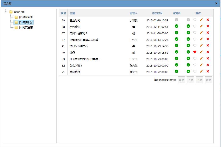 4. 相關(guān)部門的管理員對留言進(jìn)行審核、設(shè)為常見問題、回復(fù)、刪除等操作
