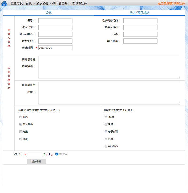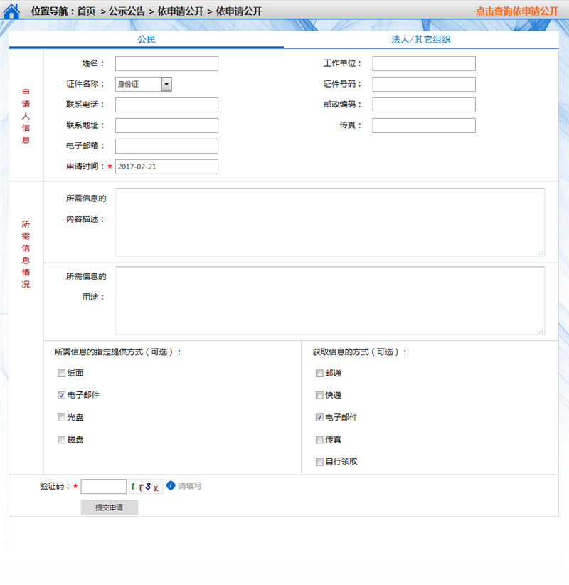 依申請公開功能,就是行政機關(guān)根據(jù)公民、法人或者其他組織的申請,依照法律規(guī)定和本機關(guān)的職權(quán),向申請人公開政府信息的行政行為。政府信息量大面廣,涉及社會生產(chǎn)生活各個方面,其中有相當(dāng)一部分信息只涉及部分人和事,只對特定的公民、法人和其他組織從事生產(chǎn)、安排生活、開展科研等活動具有特殊的作用。為了保證公民、法人或者其他組織獲取所需要的政府信息,依照相關(guān)規(guī)定除行政機關(guān)主動公開的政府信息外,公民、法人或者其他組織還可以根據(jù)自身生產(chǎn)、生活、科研等特殊需要,向國務(wù)院部門、地方各級人民政府及縣級以上地方人民政府部門申請獲取相關(guān)政府信息。