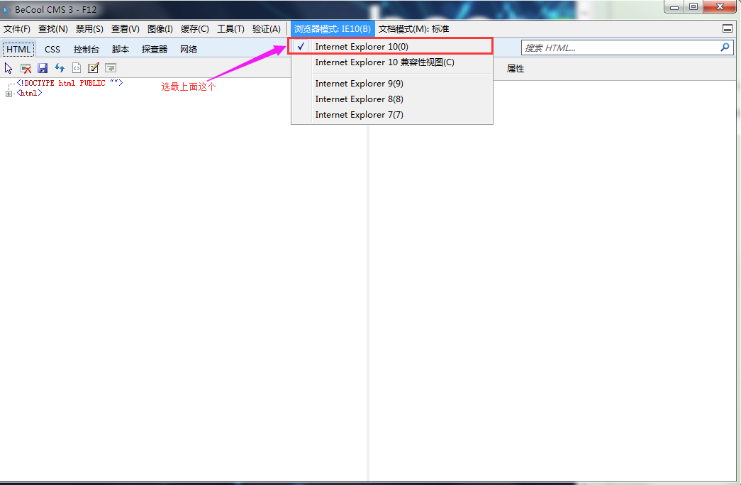看到瀏覽器模式和文檔模式,根據(jù)IE版本選擇對(duì)應(yīng)的模式。如IE10,瀏覽器模式默認(rèn)為IE10,文檔模式會(huì)默認(rèn)是標(biāo)準(zhǔn)模式。注意不要選擇有“兼容性視圖”的瀏覽器模式,文檔模式會(huì)隨之變?yōu)?/span>IE7或更低版本。