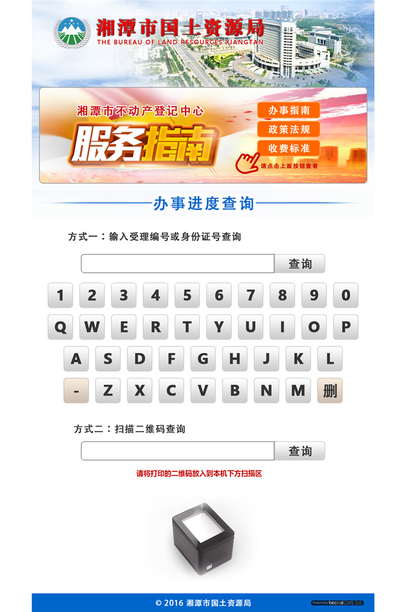 本項(xiàng)目為湘潭市國土資源局辦事大廳,用于群眾查詢辦事進(jìn)度的觸屏機(jī)上。項(xiàng)目含政策法規(guī)資訊和辦事進(jìn)度查詢兩塊,群眾只需在觸屏界面上輸入受理編號或身份證號,即能查詢到辦事的進(jìn)度。此項(xiàng)目分管或下級局屬單位可軟硬件直接成套購買后使用。